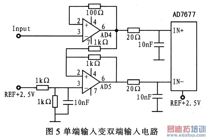 (4)单端输入变双端输入信号采集系统一般都采用单端信号输入。为了提高共模抑制比,常常需要将单端信号变成双端差分输入。图5给出单端输入变双端输入电路。