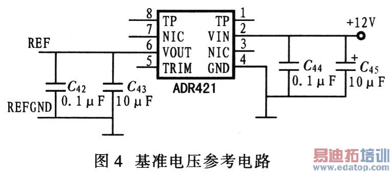 (1)基准电压当采样转换时,AD7677以基准电压作为参考电压,所以基准电压的稳定性决定了测量的稳定性。这里选择低噪声、低温漂、超高精度的电压基准器件ADR421来提供基准电压,其输入电压为12 V,输出电压为2.5 V。图4给出基准电压参考电路。