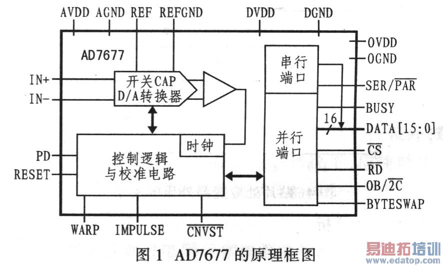 图1给出AD7677的原理框图。AD7677具有真正的16位精度,不仅能为测量系统提供较高精度,还能提供3种不同转换速率,以适应不同应用需求。在高速模式下,该A/D转换器的最大采样速率为1MS/s,它要求两次转换时间不能超过1 ms,这样才能保证全量程的精度:如果两次转换时间超过l ms,则在A/D转换器启动后将忽略第一次测量值。所以该模式一般用于需要高速测量的场合。在普通模式下,A/D转换器的最大采样速度为800 KS/s,它对两次采样之间的时间间隔没有要求,因此该模式适合用于多路数据采集系统中。而在脉冲模式下,可以实现低功耗设计,可通过节电方式来降低采样间隔期间的功耗,其最大采样速率为666 KS/s。在采样速率为100 S/s下,其典型功耗为15pW,因此该模式一般用于电池供电场合。