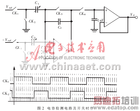 其基本原理是利用电容的充放电将未知电容变化转换为电压输出。该测量电路包括一个电荷放大器、一个采样保持电路以及控制开关的时序,如图2所示。