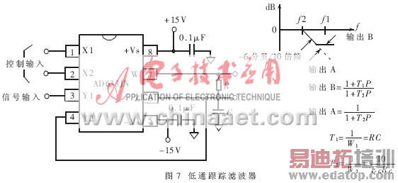 数字信号发生器具有控制灵活的优点,但是输出信号不够平滑,其中会有台阶波。在对信号要求比较高的场合,还需要进行滤波。本设计中信号的频率变化范围很大:几百赫兹到10千赫兹。为了进一步提高信号质量,采用AD633模拟乘法器构成低通跟踪滤波器,其原理如图7。