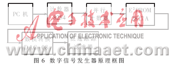 一般的RC振荡电路生成的正弦波频率靠改变R、C值来调节,不能连续大范围调节。所以,设计中采用数字方法合成模拟波形,其原理见图6。图6中8254为软件可编程计数器。其包含3个独立的16位计数器,计数最高频率可达8MHz,设计中输入3MHz的时钟,将2个计数器串连使用,这样可以增加频率控制范围。8254产生的方波信号作为后面并行计数器的计数脉冲输入。并行计数器由2片74LS161组成8位二进制循环计数器。74LS161计数到最大值时会自动清零,重新开始计数,其输出可作为E2PROM 2817A的地址信号(即每个正弦周期内采样点数为256个)。2817A的数据读取时间为150ns。设计电路时将它的片选和读信号均设为有效,以提高数据读取速度。D/A转换采用DAC-08电流输出型D/A转换器。电流输出时间85ns,放大器采用高速高精度运放OP-37。同理,D/A转换器的片选和转换开始信号总为有效,其输出跟随输入变化,提高转换速度。实验结果表明,此信号发生器完全可以生成10kHz以内可调频的正弦波。而且使用可编程计数器8254,输出正弦波的频率可以用软件方法调节。如果想输出非正弦波形,只要修改E2PROM的数据,就可以输出任意形状的周期波型。