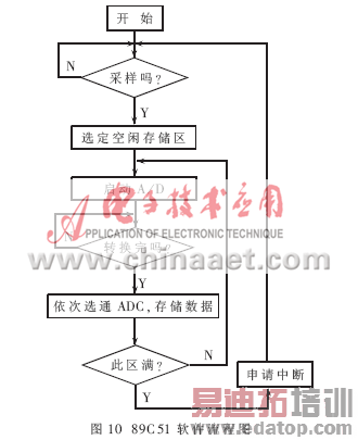 系统软件包括主机程序和逻辑控制模块中89C51程序。软件的关键是单片机控制A/D转换器和存储器部分,软件流程见图10。