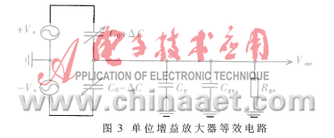 图3是单位增益放大器的等效电路。图3中,Cp为分布电容,Cgs为前置级输入电容,Rgs为输入电阻。当载波频率在放大器的通频带以内时,前置级输入电阻可忽略不计。由图3可得,前置级有用信号输出为: