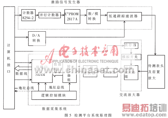使用计算机总线,与外设之间必须有接口。本系统采用双端口RAM作为数据缓存。先将信号采样并存储其中,然后成组地向主机传送,从而有效地发挥了主、从资源的效率,且设计也相对简单。