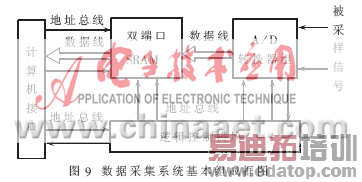 系统基本组成原理如图9。主要有双端口RAM、逻辑控制模块、A/D转换器组、计算机接口。主机通过接口启动逻辑控制模块后,CPU资源向其他请求开放,逻辑控制模块发控制信号启动A/D转换器并进行采样,并将转换结果存入双端口RAM。当RAM中的数据达到一定数量时,逻辑控制模块向计算机发出中断请求。主机接到请求后进入中断服务程序,向逻辑控制模块发出命令,决定是否继续采样,并将RAM内的数据读入内存。