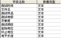 在应用LabSQL对测试样品数据库进行访问之前,首先需要建立一个标准样品数据库模型并创建一张表,在这里采用Access 2003数据库进行操作。测试参数表中除了设计40个特征值字段外,还包括其他系统设置参数,比如测试时间、文件名、测试样品、灵敏度、测试频段等,以下是对表中的部分字段设置情况,具体见图2所示。