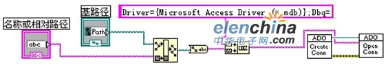 在LabSQL配置方面,本实例采用无ODBC DSN连接方式对其进行设置。其具体操作过程就是向“ConnectionString”中写入命令字符串:“Driver={ };Dbq=;Uid=;Pwd=”,Microsoft Access Driver (*.mdb)”。其中“Driver”是指定数据库驱动程序;“Dbq”是指定要访问的数据库路径;“Uid”和“Pwd”是指定要访问数据库时所需的用户名和密码。由于我们采用Access 2003作为操作数据库,其数据库驱动程序应设置为“Microsoft Access Driver (*.mdb)”;而由于访问的数据库路径是不固定的,因此赋以一个路径变量来灵活调用;访问数据库的用户名和密码这里不设置,所以可以缺省“Uid”和“Pwd”两项,具体程序框图见图4所示。与ODBC DSN连接方式相比,采用上述方式可以在程序中灵活设定数据源以及其驱动程序而无须在控制面板中手动设置,因此这种方式更适宜程序的移植和使用。