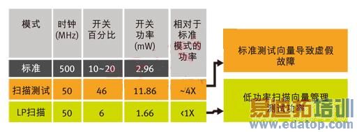 表1:使用测试波形电源管理技术的低功率扫描与传统扫描过程中开关功率的比较。