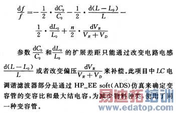 式(8)中Cmax,Cmin分别是变容二极管的最大结电容值和最小结电容值。另一方面,由于串联电容分压,加在变容二极管上的交流电压幅度减小,这样调谐电压的下限值变小,必然是变容二极管的最大结电容Cmax,可用电容变化比就更高,因此串联电容产生的影响要比上式估计值略低。