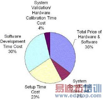 一个资料撷取系统(DAQ system)中最显着的成本当然是硬体和软体的价格。大多数人试图降低这方面的成本,但却没有考虑到整体开发成本是否有跟着下降。图一显示,硬体与软体的价格只佔整体成本的36%,而其他方面所耗费的时间与金钱佔据了整体成本的绝大部分。