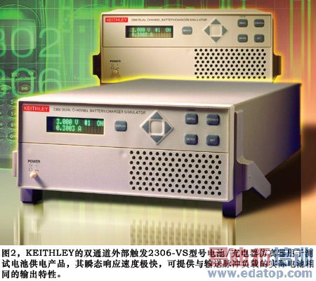 为了解决这些问题,仪器公司提供了专用电源,Keithley就是其中之一。该公司拥有多种配备GPIB的电源产品,既可提供电压控制也可提供电源监控。例如,Keithley的 2306-VS型双通道电池/充电器仿真器simulator具有外部触发功能,可用于直流电池供电产品的开发和高速生产测试,例如手机、RFIC功率放大器及其他需要直流电压电源的精密元件。2306-VS 的定价约为3500美元。