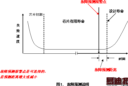 在这里提出新的概念—故障预测和健康管理。故障预测是以当前的使用状态为起点,对将来可能出现的故障进行预测,向用户及时提出警告,以便能够采取措施避免重大恶性事故发生外,对现行的系统管理和维修制度也有开创性的作用,达到及时的故障预测和有效的健康管理。Ridgetop-Group[1] 的故障预测和健康管理方案能够告诉用户当前系统的健康状态和剩余有用时间。因此故障诊断是发生在系统失效之后,故障预测和健康管理是发生在故障出现之前。下面给出Ridgetop Group 关于集成电路芯片器件和电子系统的故障预测说明图1.