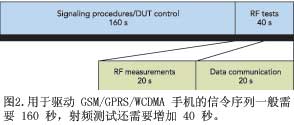 用于驱动 GSM/GPRS/WCDMA 手机的信令序列一般需要 160 秒(图 2)。如果再加进射频测试,则时间一般会再增加 40 秒。因此在传统的信令方法中,预期的射频测试时间通常需要 200 秒。如果使用非信令方法,则 DUT 可以在 40 秒内完成测试,从而可以节约多达 80% 的时间。类似 R&S CMW500 这样的通信测试仪在这两个步骤均采用了非信令技术。