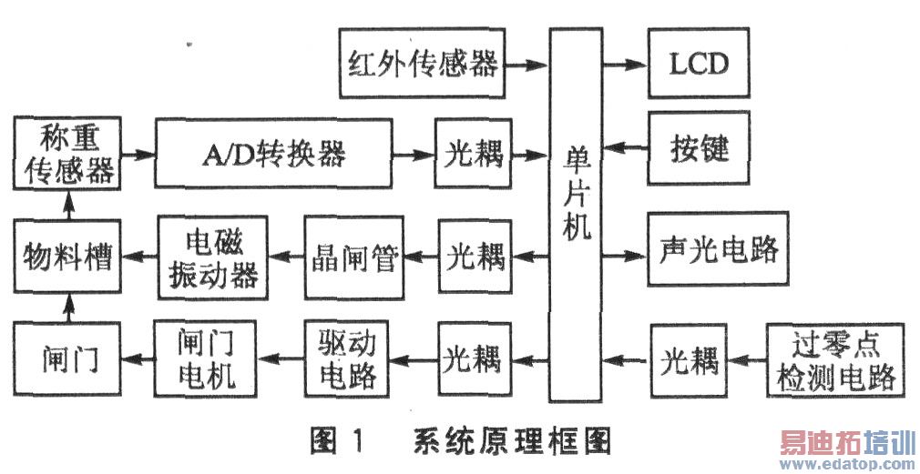 系统原理框图如图1所示。称重传感器和A/D转换器,负责采集物料重量的实时数据;双向晶闸管和电磁振动器,为物料的移动送料提供动力;过零点检测电路负责检测交流电的过零点,为晶闸管的触发提供同步点;LCD液晶显示和按键可方便用户的操作与观察;闸门电机和闸门,用于释放在物料槽中达到设定重量的物料。