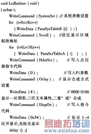 液晶显示器的显示功能之所以强大,除了其本身具备一定的硬件显示功能外,更重要的是通过软件设计来实现各种显示功能,包括基本显示和由基本显示组合而成的扩展功能显示。但在使用之前,一般都必须根据液晶显示模块的特性选择初始化参数,以对其进行初始化,初始化流程如图3所示,其具体的初始化代码如下: