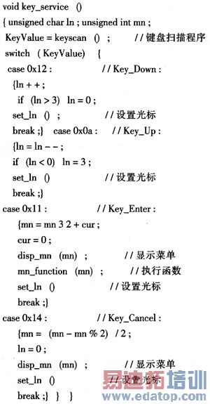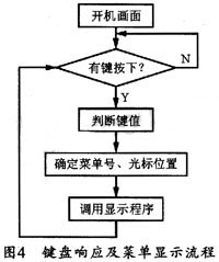 液晶模块的菜单显示设计应尽量与普通微机上的菜单结构保持一致(即呈树形拓扑结构),以适应操作人员的操作习惯。本设计中的菜单显示是在键盘的配合下实现的。为了简化操作,键盘中与菜单显示有关的控制键一般只设置“确定”、“取消”、“上翻”、“下翻”等基本功能,通过这几个按键即可操作菜单显示程序和命令执行程序,其键盘响应及菜单显示流程如图4所示。操作时,按下“确定”键,屏幕将显示下一级菜单;而按下“上翻”、“下翻”键,闪烁光标将在同一级菜单的各个菜单项间移动,以表示当前选中的菜单。对各级菜单进行编号时,可以设置两个变量mn、ln来分别表示当前的菜单号和光标所在的行(第一行为0,以此类推)。在程序初始化时,mn=0、ln=0;用“确定”键可则可改变菜单编号(mn=mn×2+ln),“取消”键改变菜单编号(mn=[mn/2]),“上翻”、“下翻”键可改变光标位置(ln=ln±1)。如12号菜单就是5号菜单光标位置处于第三行(ln=2)时按“确定”键得到的,其编号为5×2+2=12。确定菜单编号和光标位置后,再调用显示程序(或函数执行程序)即可显示新一级菜单并重新设置光标位置。其例程代码如下: