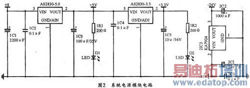 针对工业现场使用的便携式嵌入式测试仪,可考虑采用直流电源供电。本系统所需的三个电源分别为+5 V、+3.3 V、-23 V。其中+3.3 V是给C8051F020芯片供电。-23 V是液晶显示器所需的大负电压驱动电源,+5 V是驱动器和其它芯片的逻辑电源。电源模块的设计采用外部双电源供电,+8 V和-33 V直流电源经过稳压电路后可分别提供上述三种电压。具体电路设计如图2所示,其中在+5 V和+3.3 V的电源接口中连接的LED灯可作为电源指示灯,灯亮表示电源接通。电路中的电容则用于电源的滤波。