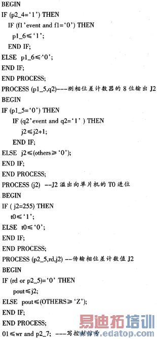CPLD控制模块的底层没计如图4所示,CPLD控制程序中的变量P2.4、p1.5、×1、×2、p2_6、rd、p2_7、wr的数据类型为IN STD_LOGIC;变量p1_6、t0、t1、o1、pout的数据类型为OUT STD_LOGIC;中间变量有f2、f1、j1、j2、q1,q2,其中f2、f1分别与图2中的波形QA、QB表示的端口一致;j1、j2的数据类型std_logic_vector,分别代表图4中两个8位计数器74393的输出;q1,q2分别表示与门7403、7411的输出。根据频率、相位测量原理,测量部分将由CPLD完成,测量结果经单片机运算后存LED上显示。由CPLD完成的相位测量部分程序以下给出相关程序代码。