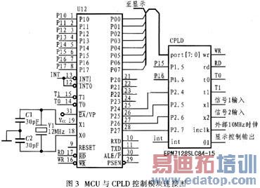 MCU与CPLD控制模块连接如图3所示,MCU采用8位单片机AT89C51,CPLD选用Altera公司MAX7000S系列中的EPM7128SLC84-15,该器件一共有84个引脚,68个I/O端口,采用EEPROM技术,内含2500个逻辑门,128个宏单元。图3中CPLD模块的×1、×2为整形后的被测信号输入端,inclk为外部时标信号输入端,t0、t1端分别与单片机的定时/计数器T0,T1相连,采用单片机内部16位定时/计数器,加上CPLD模块内的8位计数器,可使计数器位数达到24位,以此提高分辨率。P25与读信号RD、P26与RD分别控制两个锁存器74373的数据读取,此外P24、P15、P16分别控制相位和周期的测量。P27与写信号WR控制写显示器,P10、P11、P12、P13、P14用于键盘和显示的控制。单片机P0端口用于从CPLD读取8位计数器数据,另外还用于向显示器写显示数据。