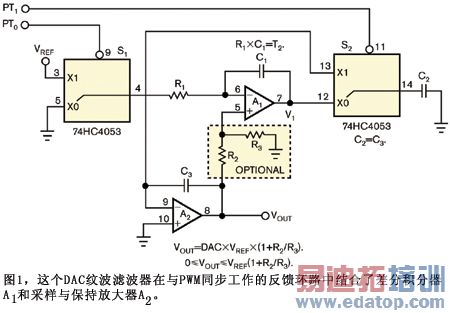 图1中的电路避免了低通滤波的多数问题,这是由于它在反馈环路中结合了差分积分器A1和采样与保持放大器A2,该环路与图2中的PWM周期T2同步工作。如果使积分器时间常量等于PWM周期时间,即R1×C1=T2,并且如果采样电容C2等于保持电容C3,则滤波器就能恰好在一个PWM周期时间内获取并稳定在某个新DAC值。虽然这个方法几乎未使得到的DAC严格地算“高速”,但0.01s稳定时间仍比1s稳定时间好100倍。稳定时间的这种改善没有对纹波衰减产生不利影响,这与速度一样重要。同步滤波器的纹波抑制在理论上是无限的,实践中的唯一限制就是从S2进入C3的非零电荷注入。选择低注入电荷开关作为S2,并选择大约1mF电容作为C3,就很容易带来微伏级的纹波振幅。