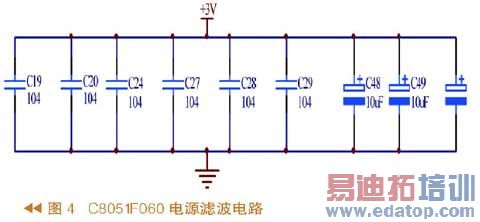 为了尽量消除系统中C8051F060在执行写操作和读取数据通过自带D/A进行转换的干扰和误差,其供电部分接入AS1117对5V电源进行转换和稳压,并且各部分均并联连接10μF和0.1μF电容,用于滤除地线干扰和电源纹波,详细电路设计分别如图3和图4所示。同样对于AT27C1024为了极大程度消除外围电路干扰,设计中采用独立的电源和并入滤波电容,同时采用电压转换芯片7805对接入的13V电压进行转换以稳定和满足AT27C1024在读取数据时所需的5V电压,具体电路如图5所示。