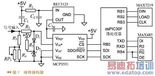 基于单片机或其他系列DSP的数据采集器,受芯片功能和结构的限制,硬件设计中往往需要较多的外围电路,导致装置的整体集成度不高,硬件开发相对复杂,使数据采集器的可靠性和抗干扰能力受到极大的限制。基于dsPIC30F系列数字信号控制(DSC)芯片,采用高精度、低噪声、22位分辨率的新型Δ-Σ A/D转换器MCP3551的高精度数据采集器,具有数据精度高、芯片集成度高、开发方便等特点。
