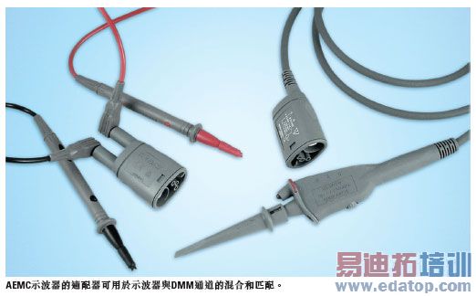 你也可以用独立的适配器,它提供连接缆线用的 BNC 插座。我用一个适配器将一台函数产生器连接到示波器上。其它适配器提供了用于 DMM 探针的香蕉插座(banana jack)。它很好用,因为你能够将多个通道混合与匹配,从而将示波器探针、DMM 线,或一些配件(如电流探针)连接到任意通道上。本次评估中的所有其它示波器都有两个示波信道和一个 DMM 信道。