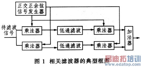 在目前的测试领域中,越来越广泛地利用相关检测的方法进行滤波。利用相关滤波可以方便地从复杂的待测信号(包括有用信号、直流偏置、随机噪声和谐波频率成分等)中分离出某一特定频率的信号。在数字技术迅速发展以后,相关滤波也经常利用A/D板对信号采样后,在计算机中实现,成为数字滤波的一种形式。本文设计了一种实现相关滤波的方法,这是相关分析在测试技术中的一个典型应用。图l所示为相关滤波器的典型框图。
