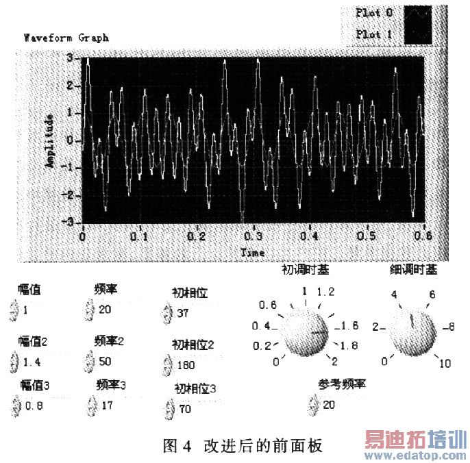 上述实现相关滤波的基础上,还可以进一步改进,使程序更加简单。改进后的前面板如图4所示,将多路信号集于一个图中显示,更加直观。同时增加了粗调和细调旋钮,显得更加精确。改进后的前面板结构更加紧凑,设计也更加合理。