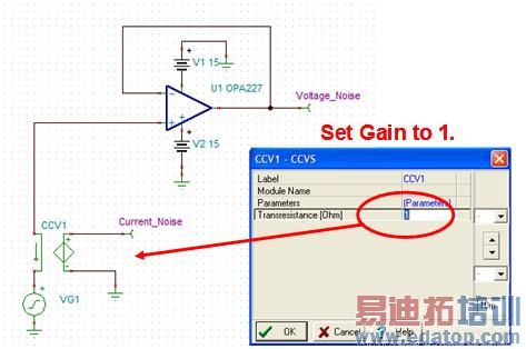 下面,我们应编辑通用运算放大器模型,其中包括开环增益和主导极点。只需双击运算放大器标志并按下 “类型” 按钮即可,这将启动“目录编辑器”。在“目录编辑器”中,我们要修改“开环增益”以匹配于我们在例 4.1 中计算所得的结果。图 4.15概述了相关步骤。