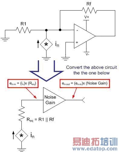 方程式 3.2与3.3:将简单运算放大器的电流噪声转换为电压噪声 (RTI)