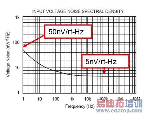 分析要做的第一步就是测定电路的噪声增益与噪声带宽。运用方程式 3.2,可计算出噪声增益即:噪声增益 = Rf/R1 + 1 = 100k/1k + 1 = 101。信号带宽受到运算放大器的闭环带宽的影像。根据产品说明书中的单位增益带宽,我们可用方程式 3.9 来确定闭环带宽。图 3.6 显示了有关情况。