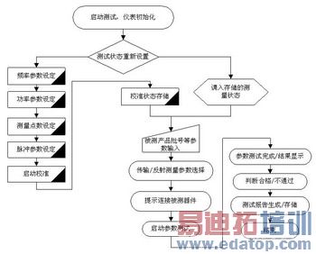 器件的测试流程在测试程序的控制下自动完成。自动测试程序直接运行于PNA网络仪上,不需要专门的测试计算机。这样可大大提高测试效率,并方便测试人员操作。基于这套自动测试系统,被测件的典型测试流程如图7所示。