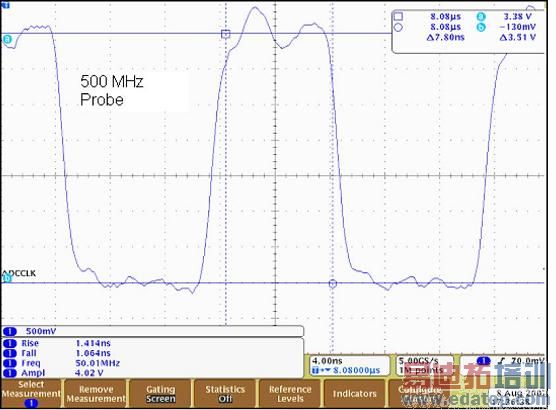 图1:利用500MHz探头测量时钟信号的屏幕抓图(点击图像放大)。