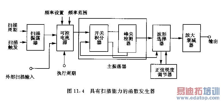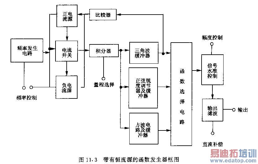 函数发生器在输出保真和方波上升沿方面性能的提高,依赖于两类相关的信号发生器的支持:低失真、低频率函数发生器和脉冲发生器。经优化的低失真信号源常用于信号保真要求很高的地方,高性能音频系统就是最明显的例子。用阻容积分器获得不同波形的基本原理是:先以一个恒定的电流源向电容充电,然后用另一个恒定的电流源使它放电。这一技术实现了三角波发生器的输出信号斜率的线性。输出信号的频率是通过选择电容的范围和充电电流来确定的,这一电流又取决子对输入电压的控制,而输入电压则通过频率调谐设置和扫描电路输入来控制。图11.3是一个函数发生器的简化框图。