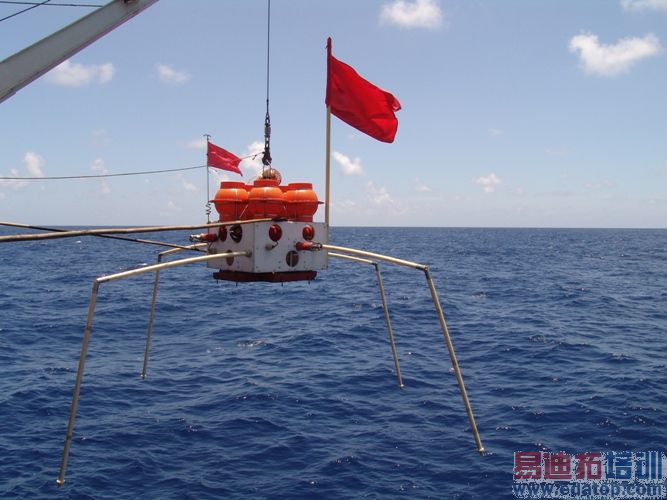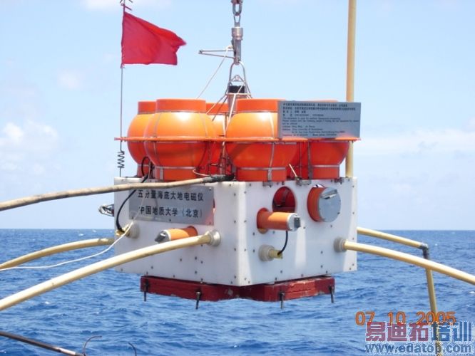 探测过程:作业船携带探测仪器沿预定的测线航行,逐点投放仪器。测线长度和点距根据探测任务预先设计。每台仪器在海面的投放时间约40分钟,这40分钟内需做的事情是,仪器的GPS对钟、采集参数设置、关闭承压密封舱、安装电场测量臂及电场传感器、起吊投放等。仪器测量海底的两路水平正交的电场(Ex,Ey)平与垂直两两正交的磁场( Hx,Hy,Hz)信号,以及仪器在海底的姿态信息。为消除海底环境因素对测量的影响,便于数据处理时进行各种校正,还附有环境信息的监测功能。仪器在海面被投放之后,自由下沉抵达海底,采集过程全自动化,作业船无需再对其进行干预,海底的仪器自行完成数据采集。电路板和电池安装在承压舱中,舱外的电场与磁场传感器通过水密电缆将电磁信号传送至舱内。每台仪器一般需在海底连续测量数天。作业船完成了仪器投放,可驶离投放点,去执行其他海洋调查任务。待海底的测量完成,作业船驶回原投放点。通过声控释放方式改变海底仪器的浮力性质,使其自动实现上浮,从而在海面上完成设备回收。对所有的探测数据,需带回室内进行统一处理,最后提交被测区域的海底地电模型。