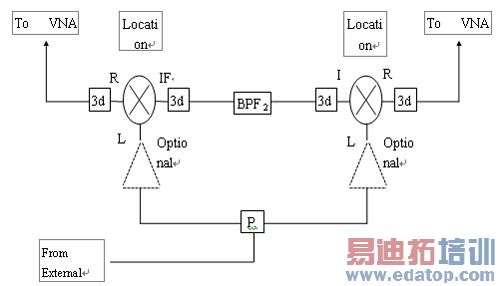 注意框图中的混频器是同种类型的,背靠背的。第一个下变频,第二个上变频,使VNA输入输出信号在频率上一致。