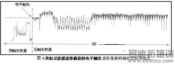 图4中的波形是数码相机的耗用电流,它仅在拍照时激活。此时它是电流分路器上的电压。波形代表着自动聚焦的机械运动、处理照片、驱动显示和状态LED,以及把结果保存在Flash存储器中。该数字万用表的电平触发适用于任何测量功能。此时的DCV的测量以50K采样/秒进行。对于1M 读数,能以这样的速率保存20s的数据。预触发和后触发允许您围绕事件建立类似示波器的波形捕获。数字万用表将进行连续测量,直至遇到电平触发。它会保留测量的预触发计数,然后开始后触发测量计数。这是等待异步事件的一项极好技术,在预触发计数与后触发计数间不存在测量的不连续。