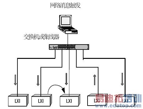 实现网络消息触发的系统结构如图3所示,多个LXI设备之间通过交换机或集线器连接在一起,网络触发消息可以由计算机发给所有设备,或者由其中一个设备发给其它所有设备,这样就可以实现一点对多点的触发应用,因为触发消息在网络间的传递是采用标准UDP网络协议,不需要网络握手,所以网络延时比采用TCP/IP协议时小的多;另外,触发消息也可以由其中一个设备发给同一网段中的另一个设备,这是点对点的触发方式。采用网络消息触发的优点是: