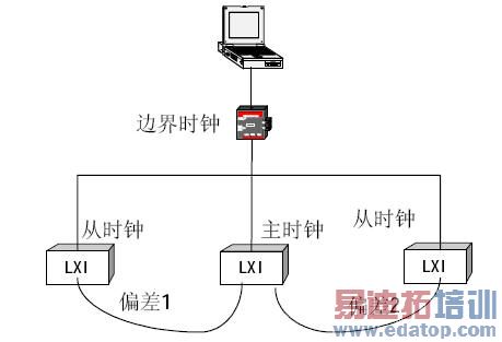 IEEE-1588的时钟同步网络拓补结构如图4所示。在网络中选择其中一个LXI仪器做为主时钟仪器,其它仪器为从时钟仪器。同步原理如图5所示。