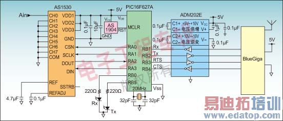 数据记录仪电路内有一个连接到PIC微控制器的AS1530 ADC,利用RS232线缆连接到BlueGiga WT12蓝牙模块进行通信。该模块通过蓝牙链接将数据发送到第二个完全相同的BlueGiga WT12模块,第二个WT12模块再通过RS232线缆连接到PC机。PC机上运行着用Visual Basic Version 6编写的一个Windows程序,该程序将接收到的数据载入Excel电子表格供分析和制图。