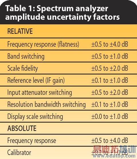频谱各个元件之间的相互作用是误差的来源之一。表1列举了部分幅度测量误差的来源。大多数仪器厂商在其产品的指标中都会同时注明绝对和相对不确定度。因为相对不确定度对两种测量都有影响,因此本文将重点讨论相对不确定度。