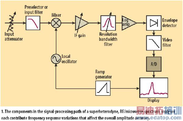 频谱仪通常采用YIG调谐滤波器作为预选滤波器,YIG滤波器也会影响频谱仪的频响特性。该滤波器必须精确的调谐和对准,以避免引入额外的频响变化,由于本振的扫描速度有限,因此YIG滤波器还要加上一些延迟和补偿,以保证其中心频率和本振同步。频谱仪的前端通常还加一个低通滤波器,在测量YIG预选器不能达到的低端频率的信号时(通常2GHz以下),该低通滤波器用于滤除高频信号。尽管该滤波器也会影响整体的频响特性,但是其影响比YIG滤波器小很多。