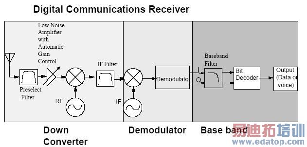 接收器的功能基本上是发送器的反向过程,因而它们带来的测试挑战也非常相似。接收器必须在有潜在干扰的条件下成功地捕获RF信号,因此,必须有一个前端选择滤波器来滤除或减弱由天线接受到的系统频段以外的信号。低噪声放大器(LNA)可以放大目标信号的幅度,但同时也会保证尽可能少地增加噪声幅度,下变频器通过与本振信号混频把RF信号转换为频率较低的中频信号。混频器的输出信号再通过中频滤波器削弱由混频器或相邻通道产生的无用的频率分量。