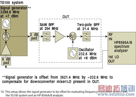 比如,利用TG100模块和HP8566来对一个下变频器进行扫描分析(图10)。通常,为了在第一频带应用TG100和HP8566,信号发生器频率设置为3621.4MHz。但由于本例中的DUT使用了一个LO频率为232.6MHz的混频器,所以必须对信号进行偏置补偿,否则跟踪发生振荡器的输出信号将是错误的。解决办法是:设置信号发生器的偏置补偿频率为232.6MHz,使得信号发生器的输出频率为3388.8MHz。这样,跟踪发生振荡器就输出可以补偿DUT内部频率偏置的正确频率。
