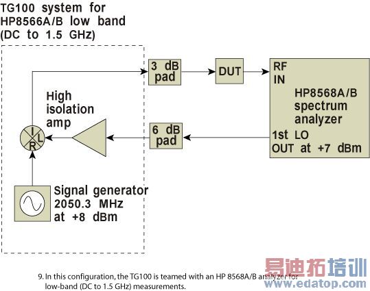 图9所示的为TG100系统,用于HP8568A/B光谱分析仪(直流到1.5GHz)低频段测量。对于固定的第二LO而言,分析仪的第一IF端额定工作频率为2050.300MHz(信号发生器调谐在该频率),不过第二LO具有一定量的扫描范围,此时该范围小于2MHz。可通过使用“SHIFTT”指令序列来禁用第二LO端口信号的该扫描功能,并不影响跟踪信号发生器的性能。这时,就使得分析仪工作在:只有第一LO端口扫频和第一IF端口信号固定的模式下了。端接50负载时,结果显示该测试装置的动态范围大约为90dB。