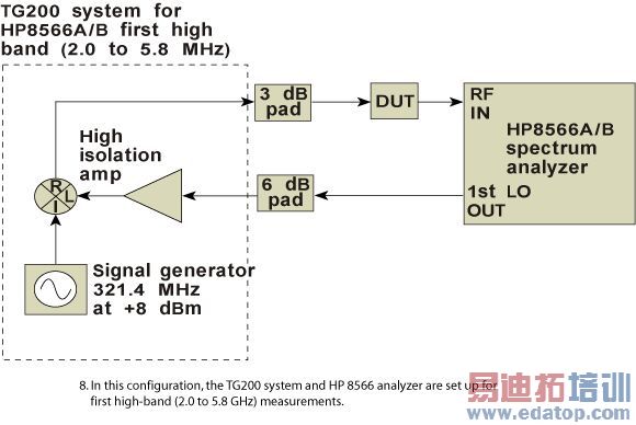 图8所示,TG200被设置来为HP8566光谱分析仪第一扩展高频带提供跟踪发生器扫描信号。对于该高频带测量,混频器的端口1与信号发生器连接。对应于全频带(2到22GHz)分析仪的第一IF端的频率均为321.4MHz(信号发生器被调谐在此频率)。此时,混频器的R端口包含了有效的跟踪发生器信号以及有害的镜像。分析仪输入端的YIG跟踪滤波器可以有效的消除这种有害的镜像信号。