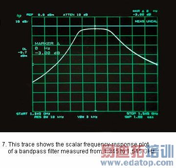 低频带跟踪信号发生器系统可用来测量中心频率为1445MHz(图7)的带通滤波器。开始频率为1345MHz,截止频率为1545MHz。纵坐标刻度为10dB/div,分析仪的衰减设定为10dB,1s的扫频周期,10kHz的RBW和3kHzVBW。在扫描开始前,通过运用图像减法来去除跟踪发生振荡器输出线的变化来设定基准线。