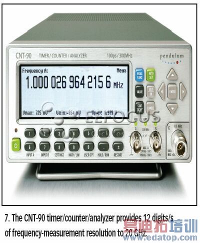 CNT-90(如图7)这样的连续时间戳计数器允许进行单个时间段的“背对背”测量,在测量之间没有死时间。在尝试检测“遗漏时段”以及要在一个序列中跟踪所有周期时,这一性能是相当重要的。对这一性能的应用是多种多样的,从串行数据通信系统和组件的评估,到机械旋转感应器的测试。传统的倒数计数器最多也就只能每隔一个时段进行测量,并还会导致所有测量中有50%的测量具有不确定性。而消除了倒数计数器中的死时间的连续时间戳计数器,则可以计算高频震荡器的阿伦方差,而这是测量相位噪音和频率稳定性中所必须的。
